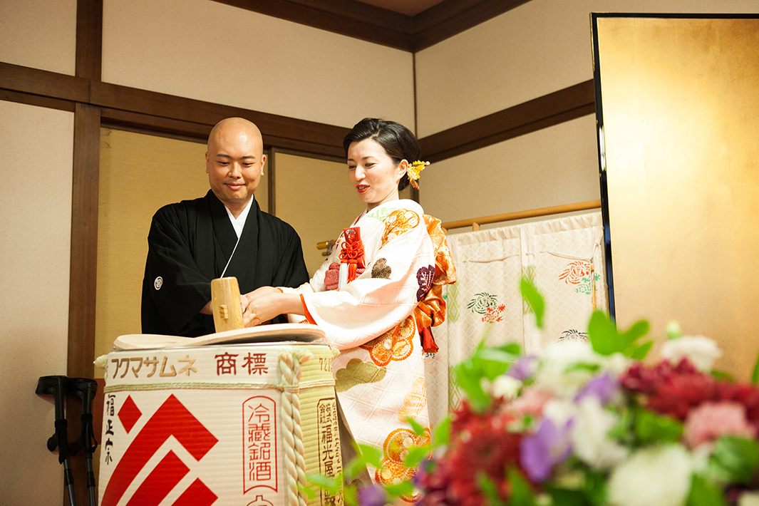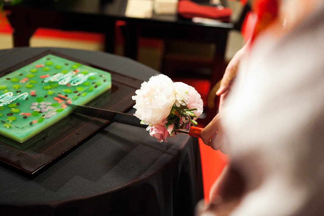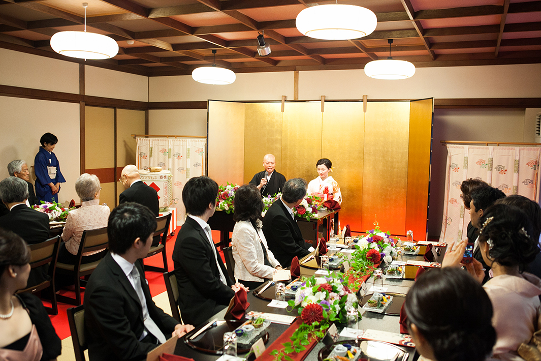 新郎様はお仕事で金沢と京都を行き来され、新婦様は愛知にお住まいで建設会社の代表と多忙な毎日を過ごされていて、「結婚式は京都で、ご親族もご友人もお世話になった方皆様をお招きされての披露宴を」というご希望でした。