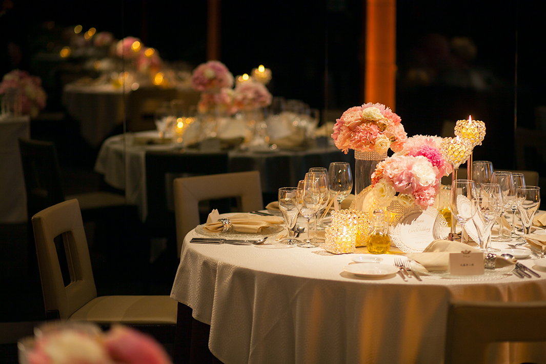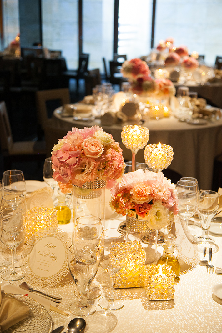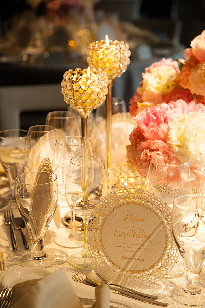 また、きりっとしたキャリアウーマンの新婦様はひそかにキュートなものやピンク、そして実はディズニーがお好きでした。ヴィジュアルイメージを挙げて頂きヒアリングする中で、「これはゴージャス&オーセンティックだけでは括れないテイスト!」と発見があり、コーディネートや演出やBGMにその要素を組み込んでいきました。