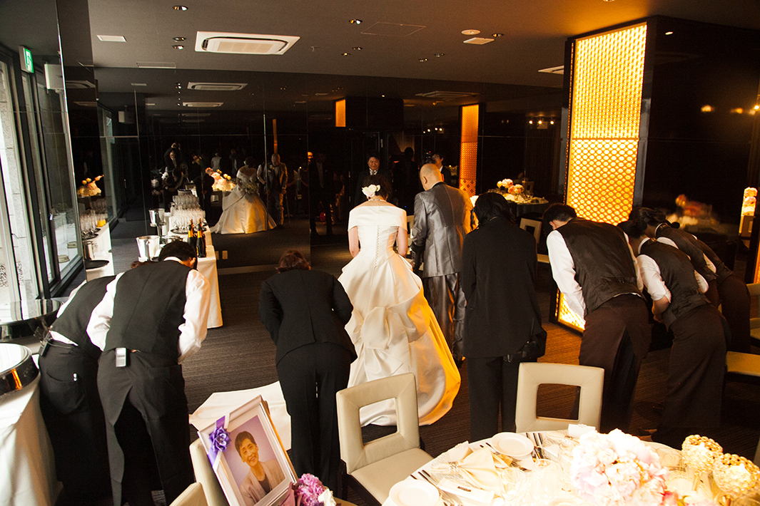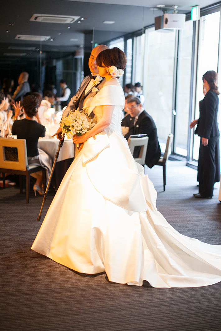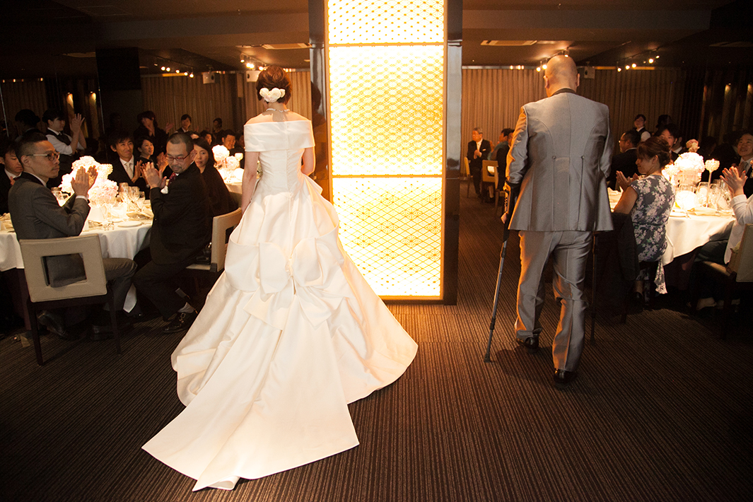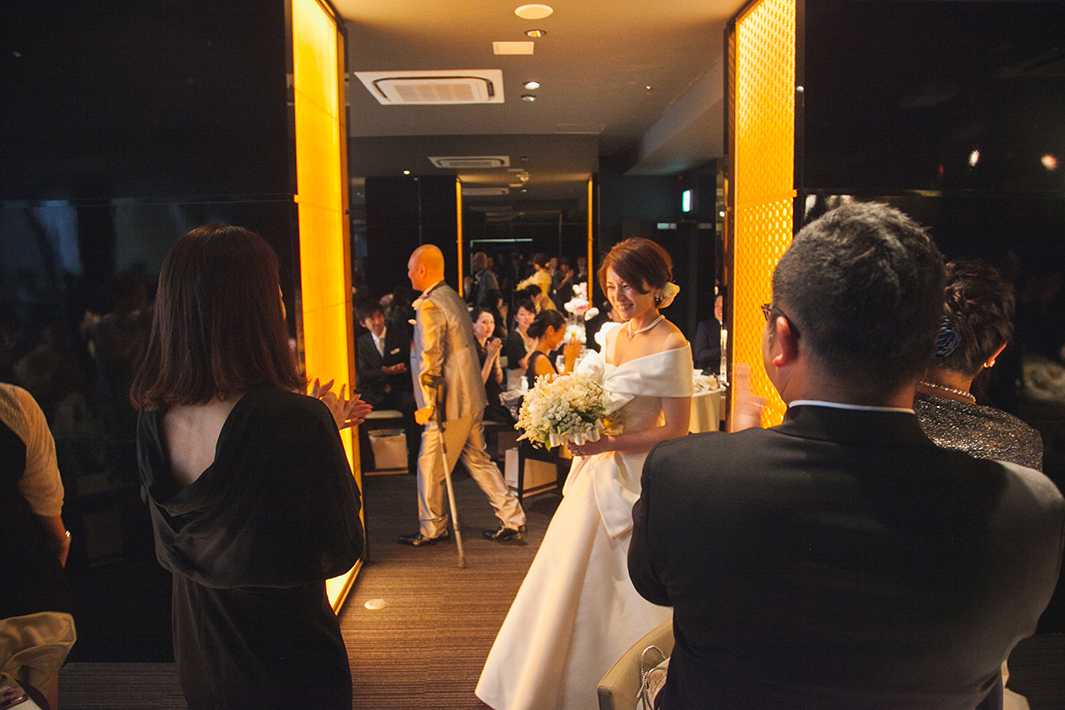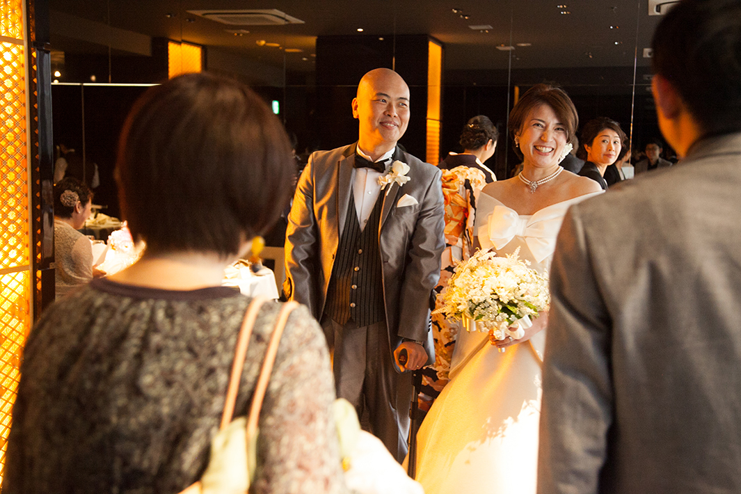 オープニングはクラシック。オーセンティックそのものですが、会場の中でゲストをお迎えされるスタイルですでにお話が弾んでいます。おふたりのテーブルに向かわれる時もそれぞれ別々にお相手側のゲストにご挨拶をされながらメインテーブルへ。クラシックから一変したノリの良い曲とぴったり合ったゲストの手拍子が響く中パーティスタート。