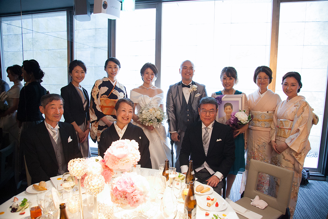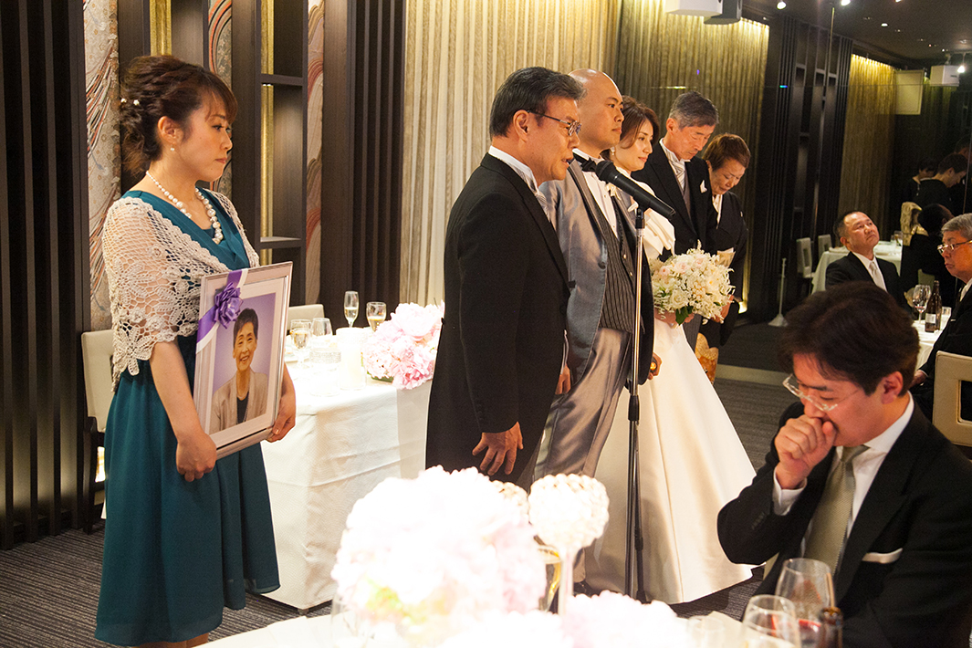 今日のパーティでは、お母様の席に花束を置かれ感謝の気持ちを以て披露宴の報告をされました。挙式の動画が流れると、そのお姿に新郎妹様が涙される場面が。私たちスタッフも金沢での結婚式にご一緒させて頂いていたので、そのお気持ちが痛い程伝わってきました。