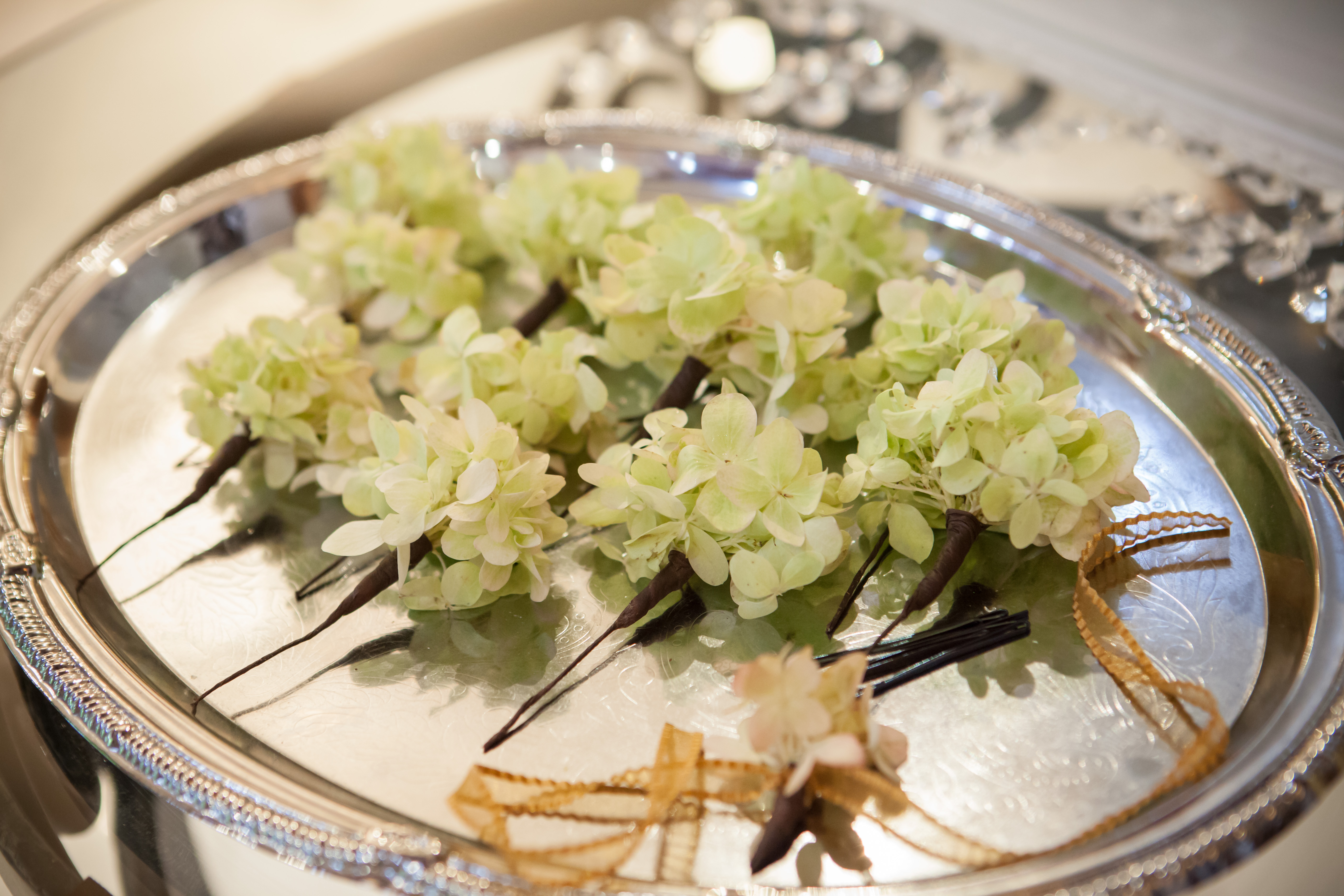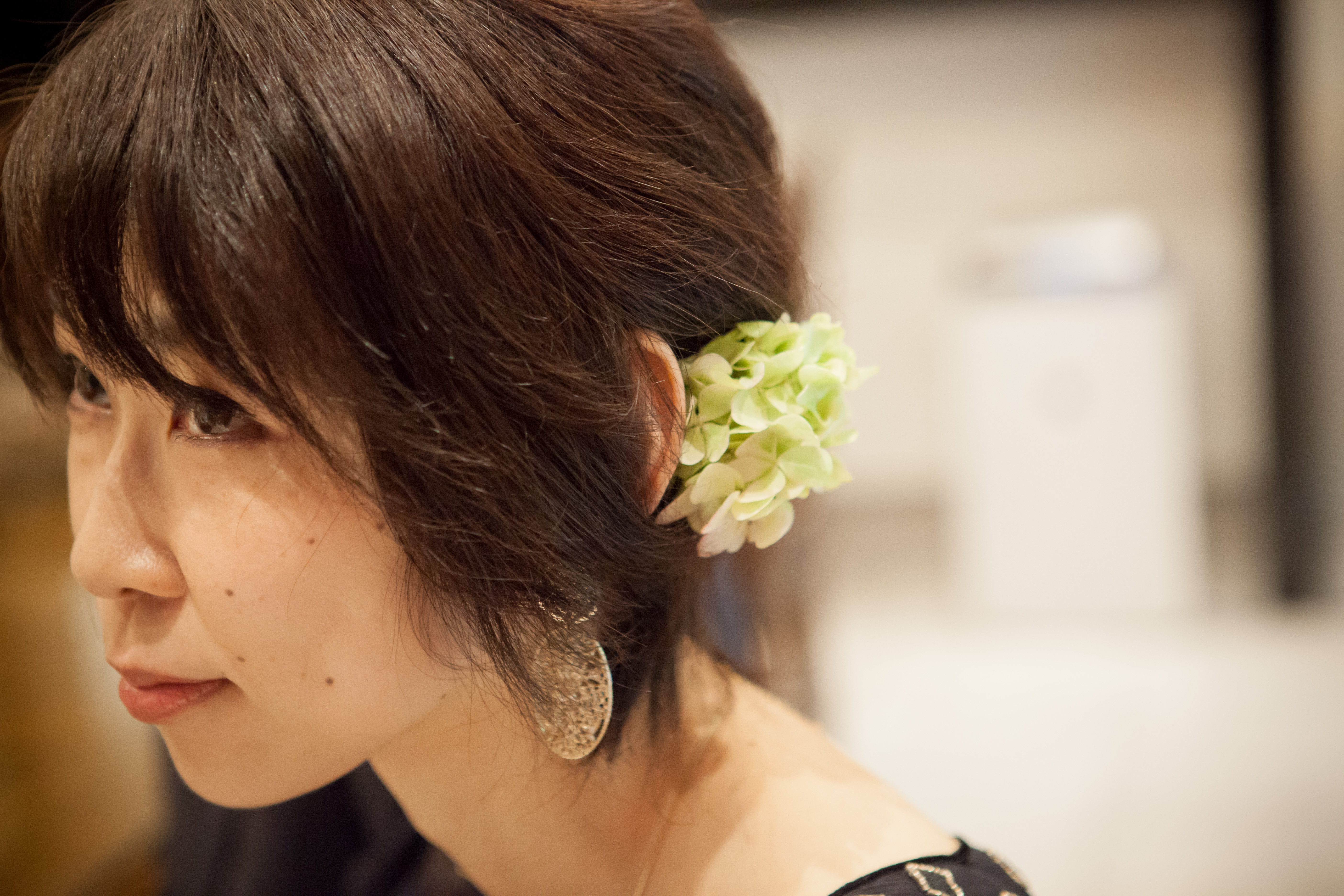 新婦様のブーケと同じお花、紫陽花で作ったアクセサリー。男性はブートニアとして、女性はヘアパーツとして挙式前に身に付けて頂きました。