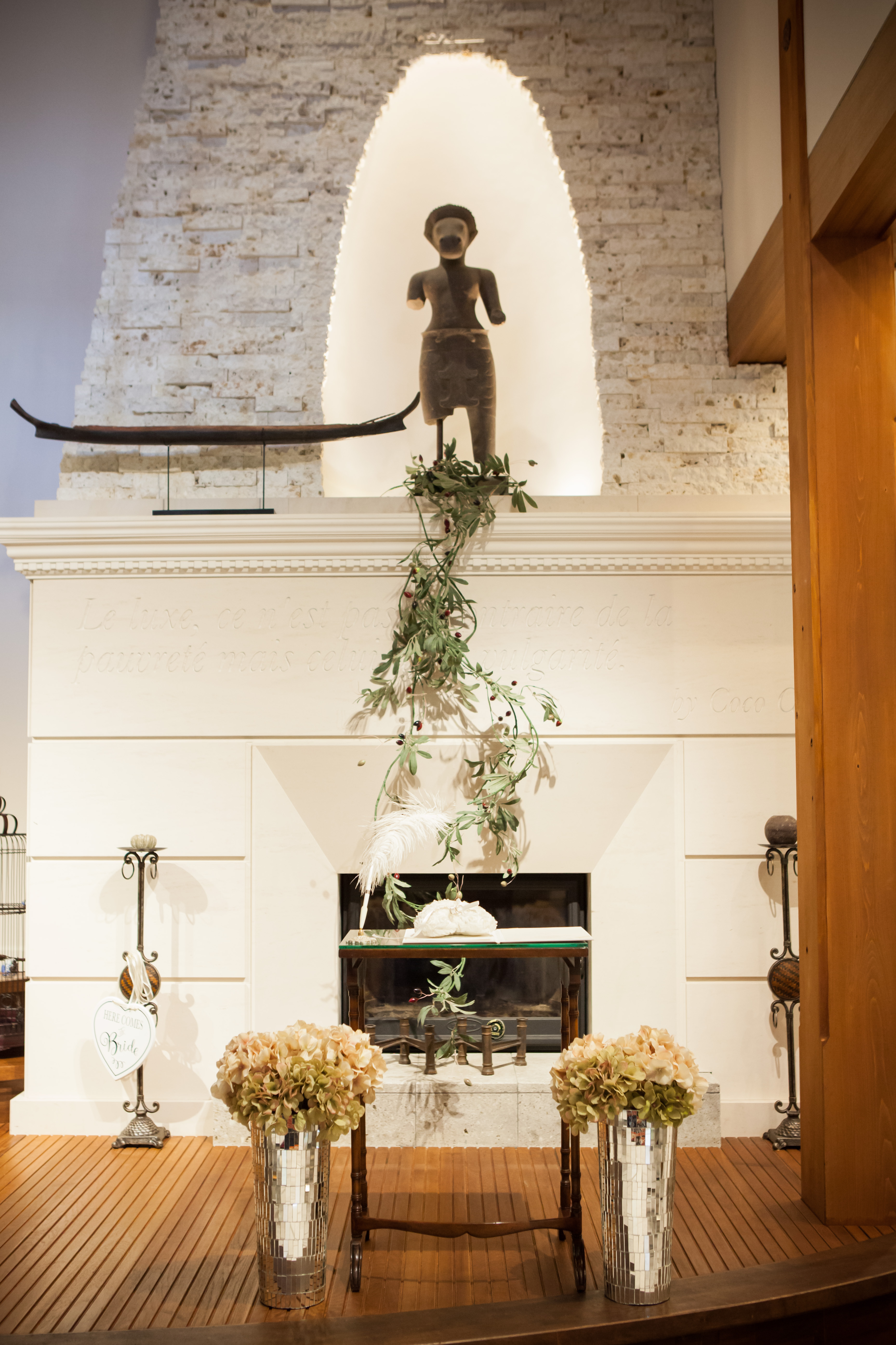 マントルピースの前に、おふたりを囲むようにセッティングされた挙式スペース。