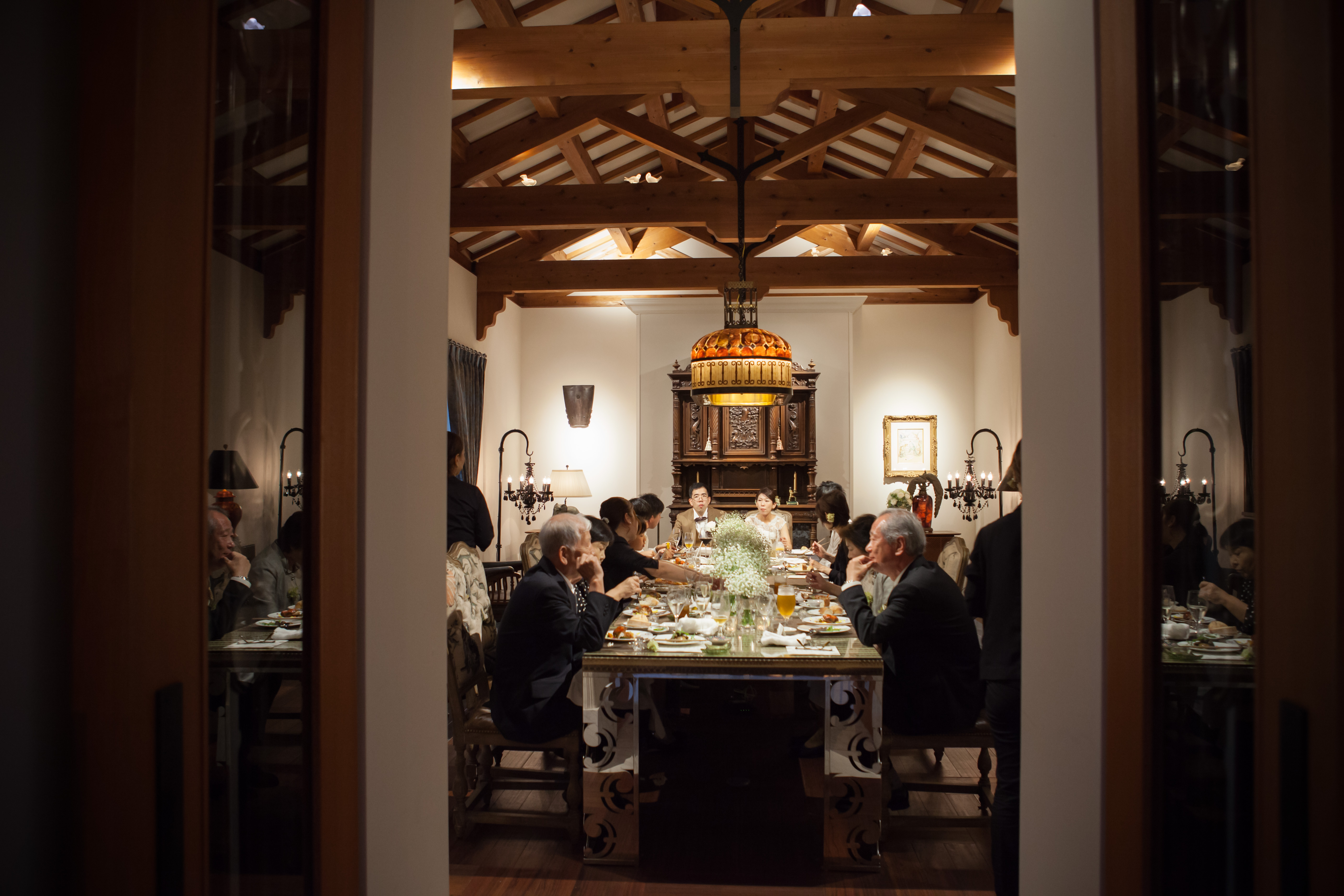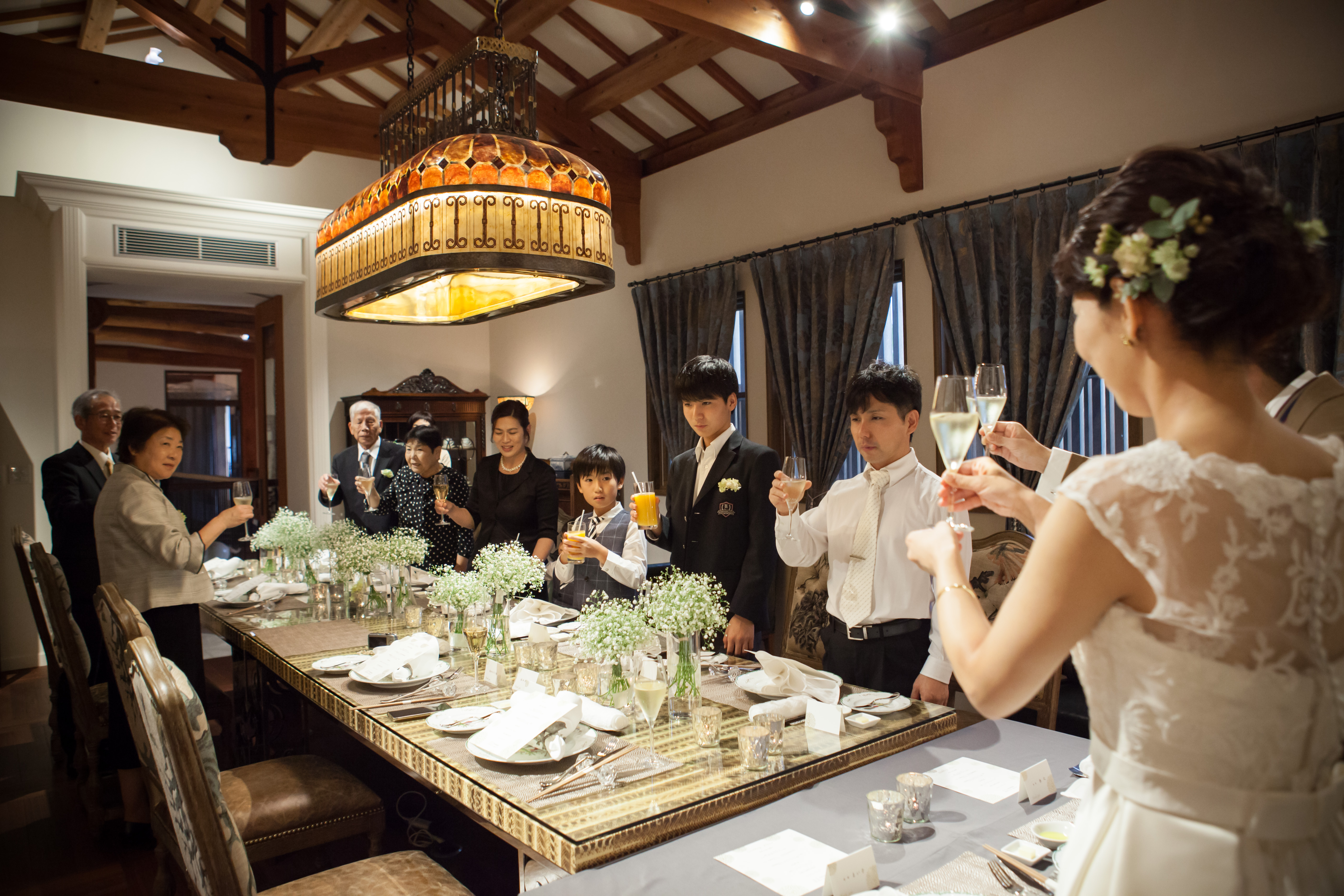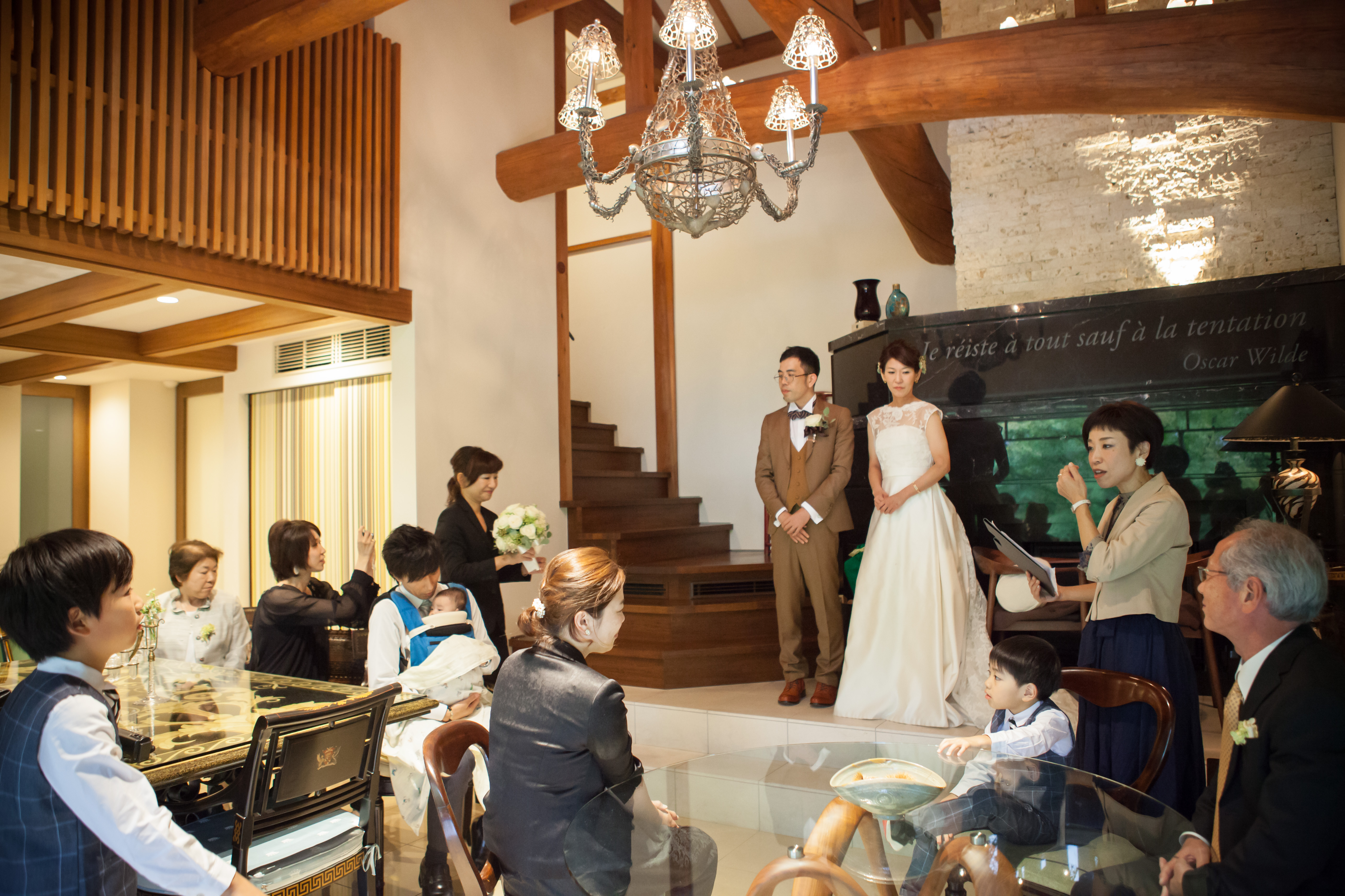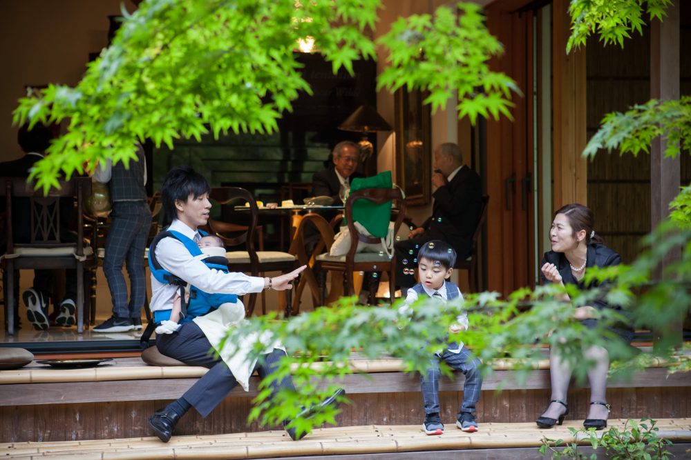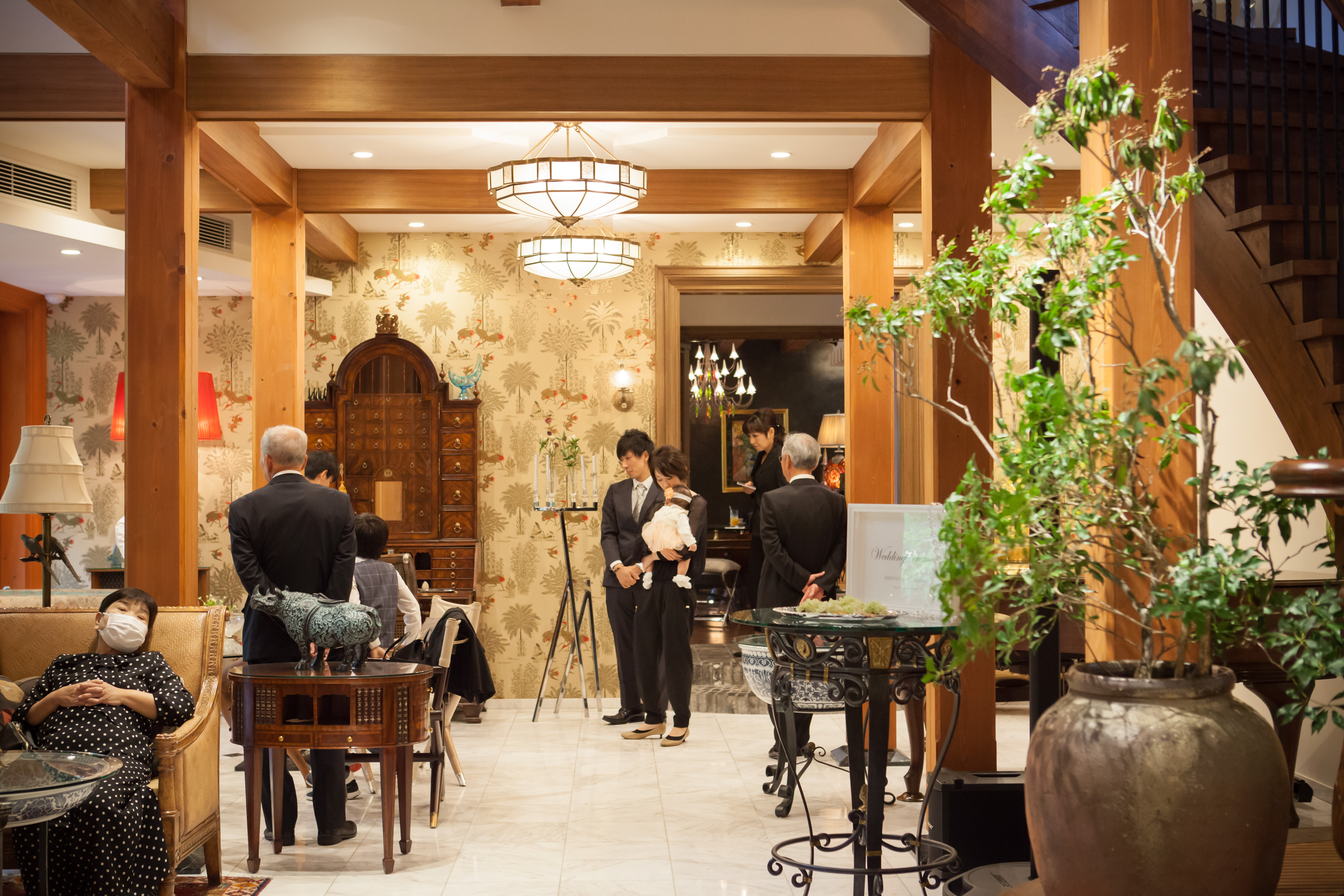 外観は和の趣でありながら、邸宅の中はヨーロピアンとアジアンスタイルがミックスされた邸宅。おしゃれなバスタブが備わったベッドルームでお支度スタート。まもなくご家族がひとりふたりとご到着。お酒を楽しむお父様。会話が弾むお母様。子供たちはそれぞれの部屋を探検・・・、とカクテルパーティはメインルームでそれぞれが過ごされました。