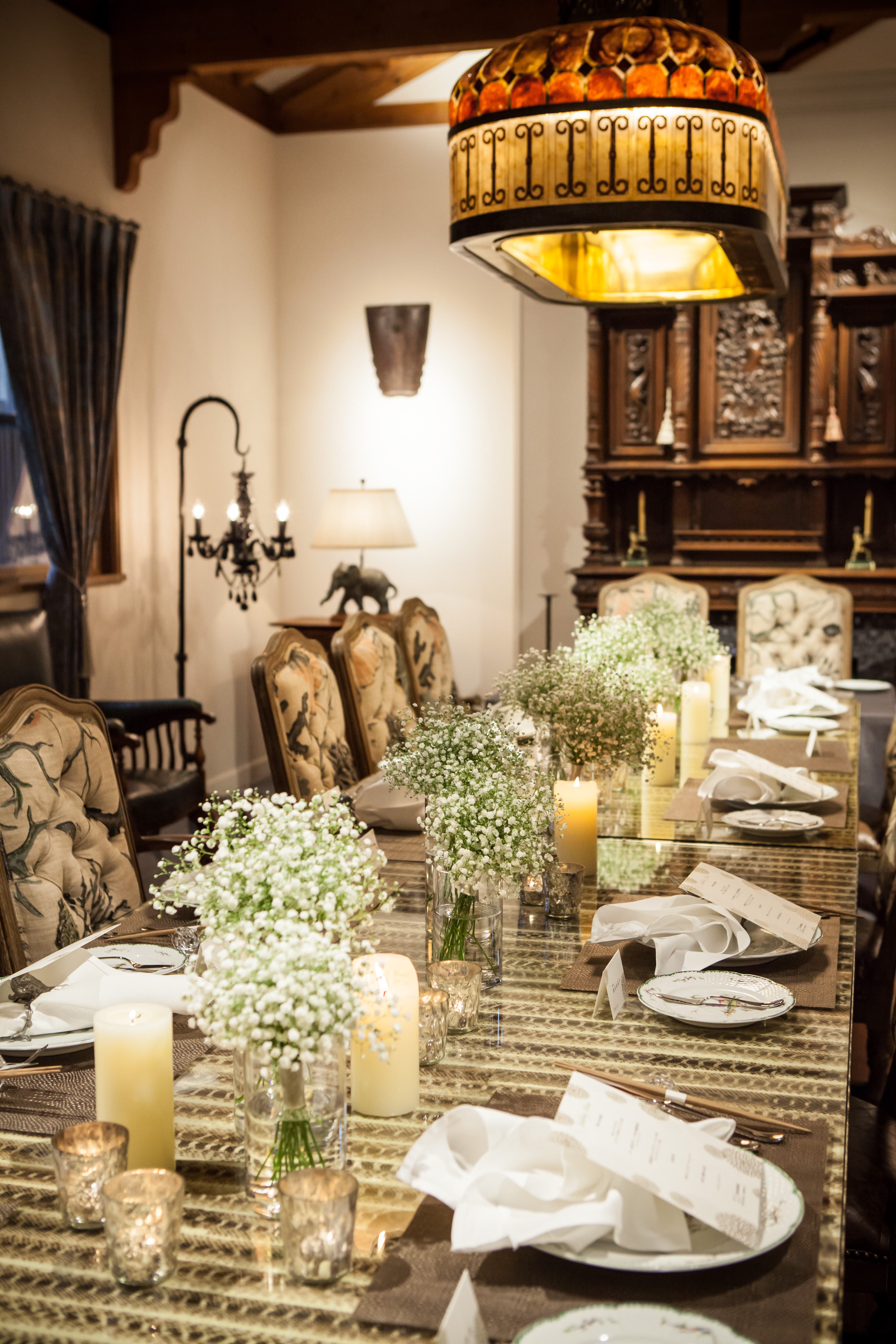 正餐スタイルの重厚感のある会場装花はかすみ草をたくさんあしらい、結婚式のヴィジュアルイメージ「シンプル×エレガンス」でまとめました。