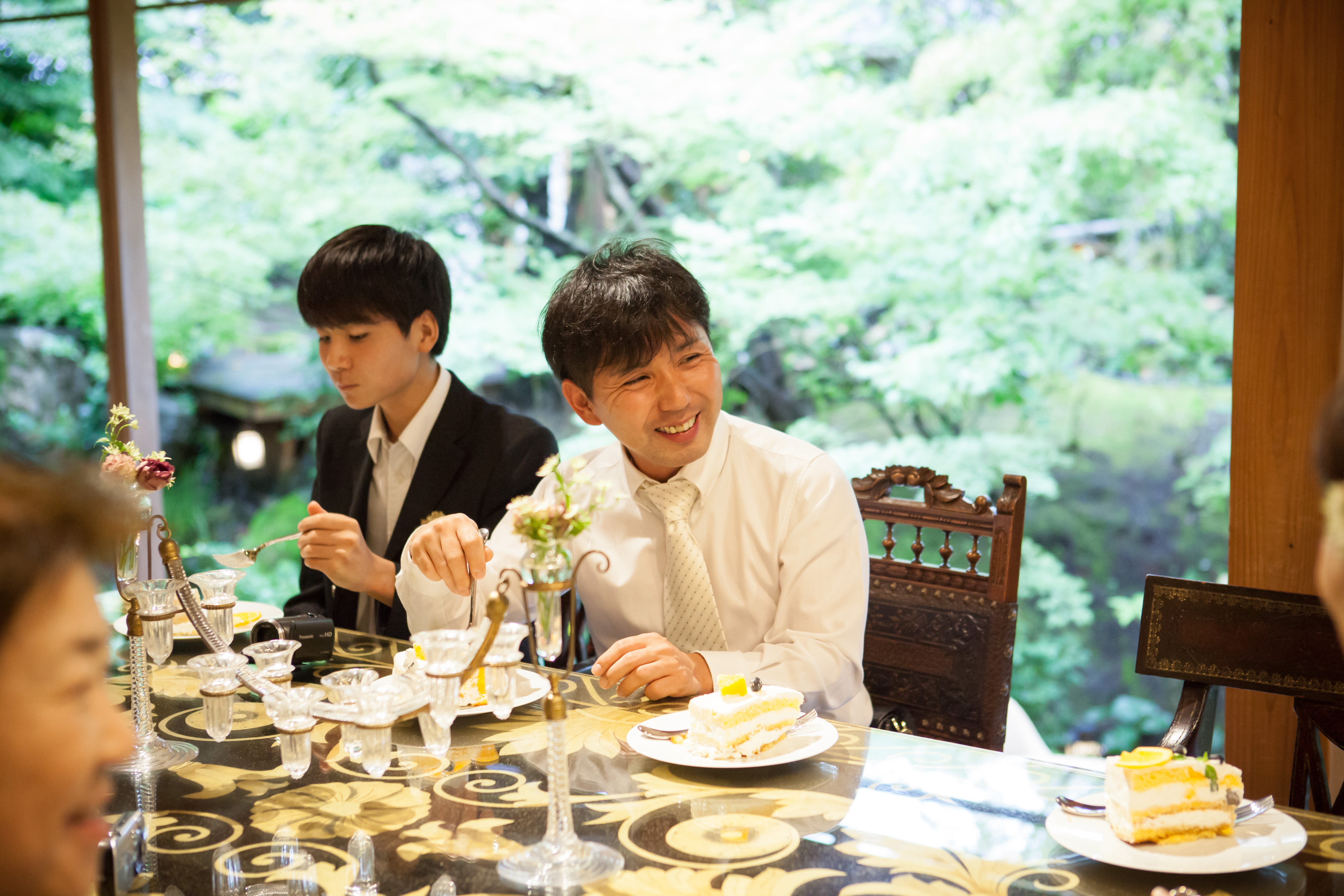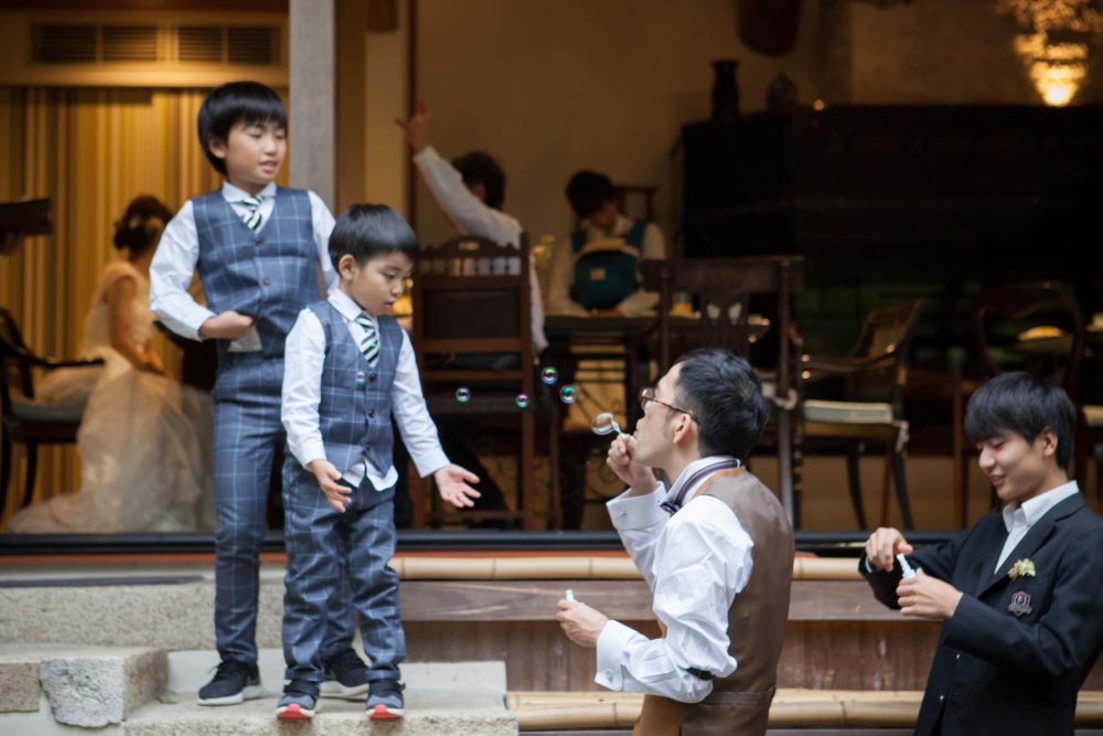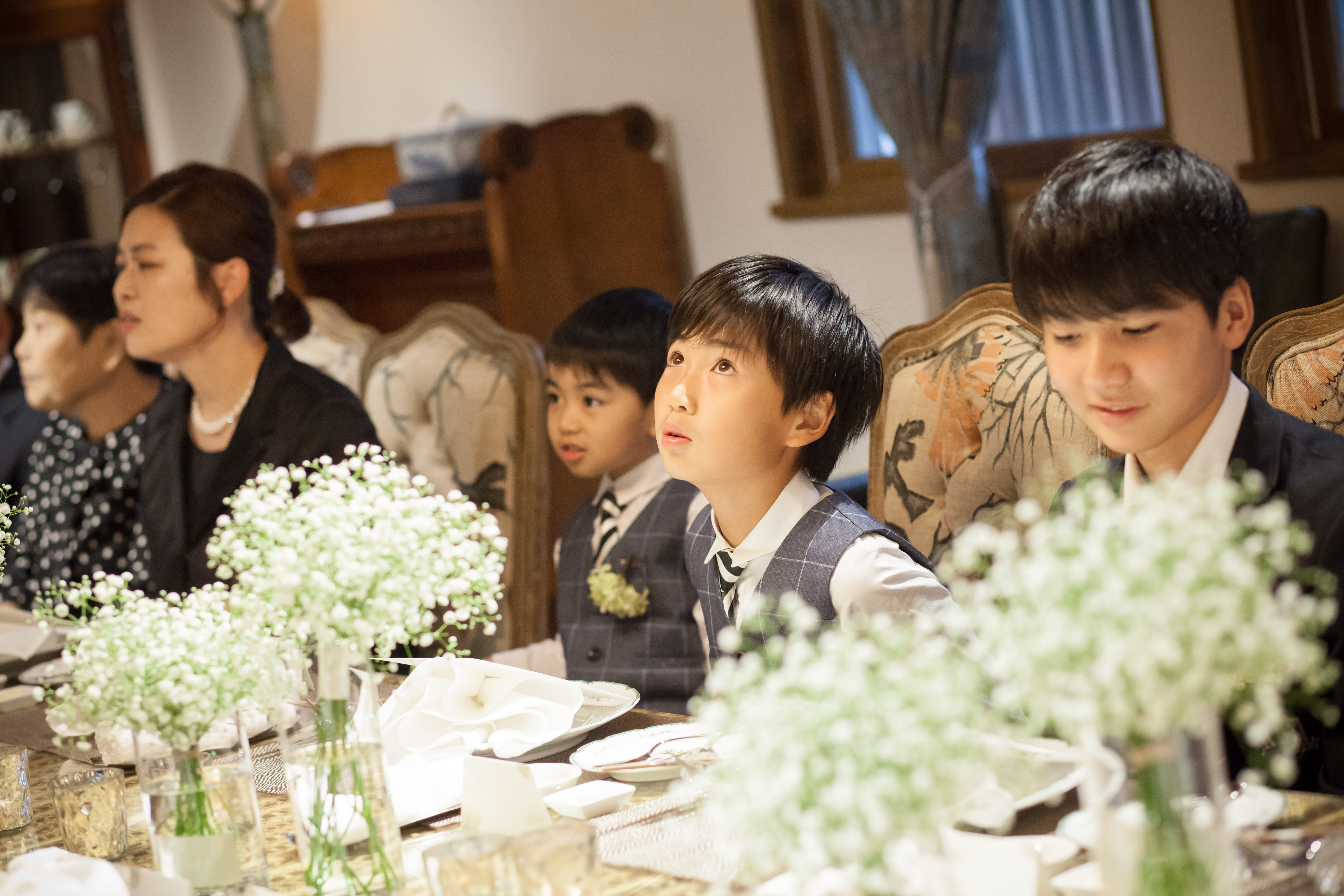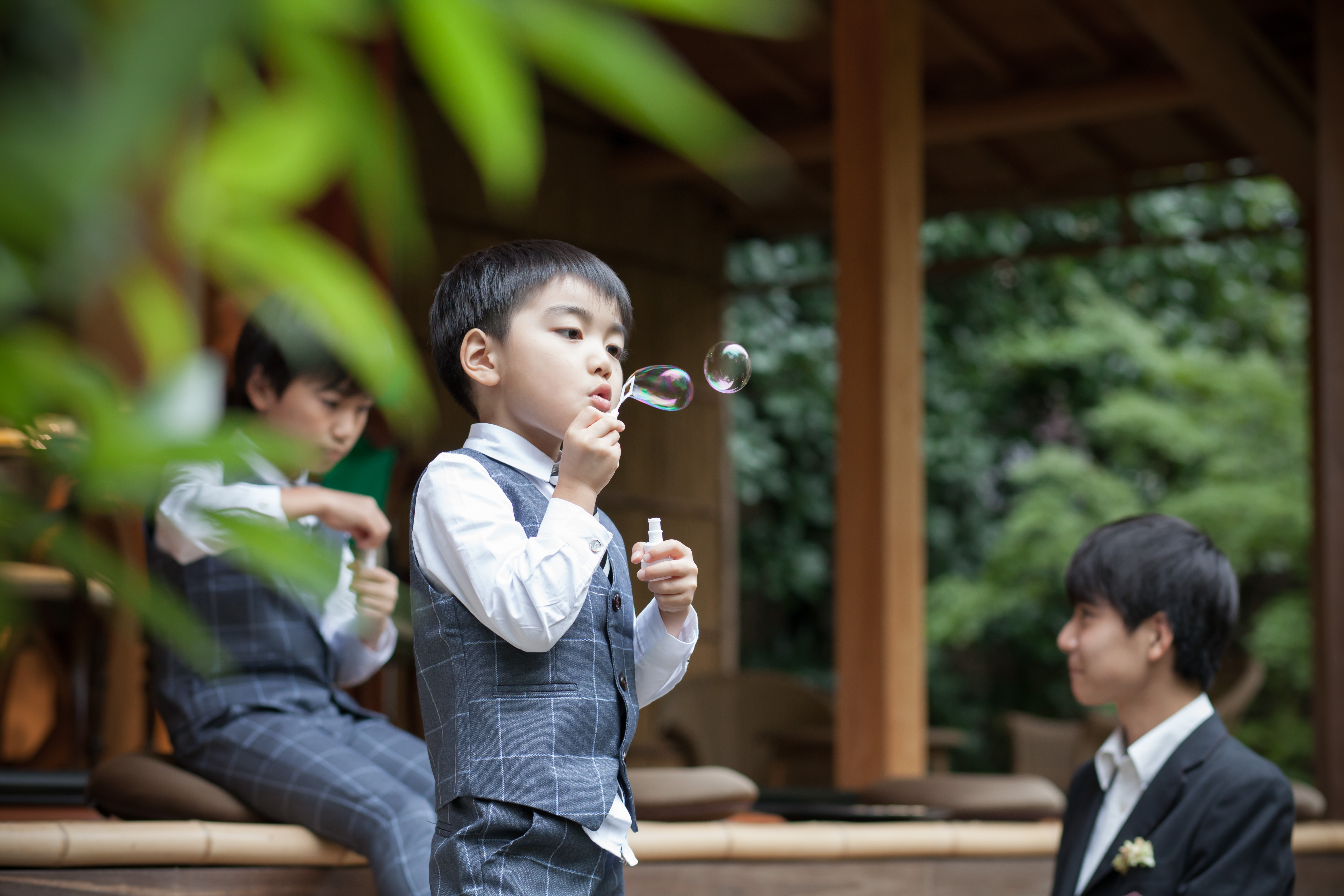 子供たちは新郎様があちらこちらに隠されたプレゼントを探したり、シャボン玉で遊んだり、と大忙し。お父様を中心とした男性陣はゆっくりお酒を召し上がり、新婦様や女性陣はスィーツとお話を満喫されていました。